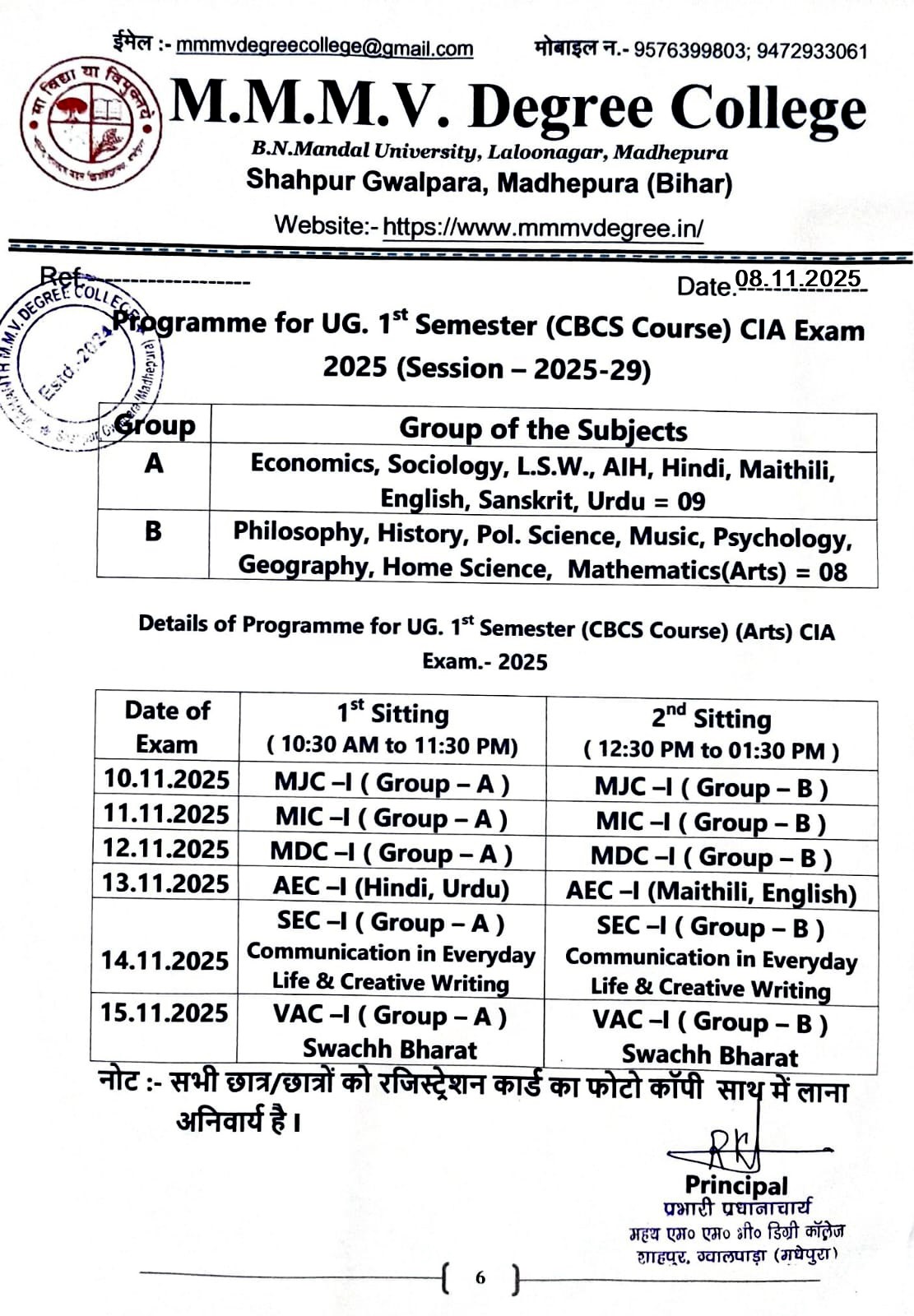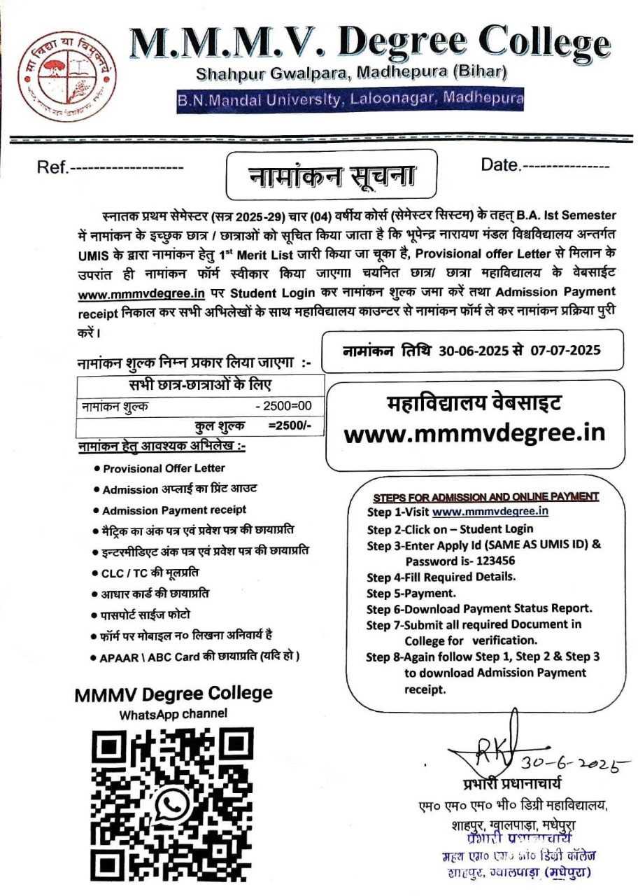 Mahant Mahaveer Moti Visheswar Mahavidyalay (MMMV Degree College), established in 2024, is a private institution located in Shahpur, Gwalpara, Madhepura district, Bihar. Affiliated with B.N. Mandal University, Madhepura, the college offers undergraduate programs in various disciplines, including A.I.H. & Culture, Economics, Hindi, English, Sanskrit, Maithili, Urdu, History, L.S.W., Sociology, Public Admistration, Psychology, Political Science, Geography, Music, Home Science, Philosophy, and Mathematics(Arts). ([M.M.M.V. College][1]) MMMV Degree College is committed to providing quality education to students in the rural regions of Madhepura district. The college boasts experienced and dedicated faculty, modern classrooms, and a well-equipped library to support academic excellence. With affordable fees and scholarship support, the institution ensures that higher education is accessible to all. Active cultural and academic societies provide students with opportunities for holistic development. ([M.M.M.V. College][2]) Under the leadership of Principal Rajesh Kumar Singh, MMMV Degree College continues to serve as an important educational institution in the area, fostering an environment that encourages learning and personal growth. For more information, prospective students and interested parties can contact the college.